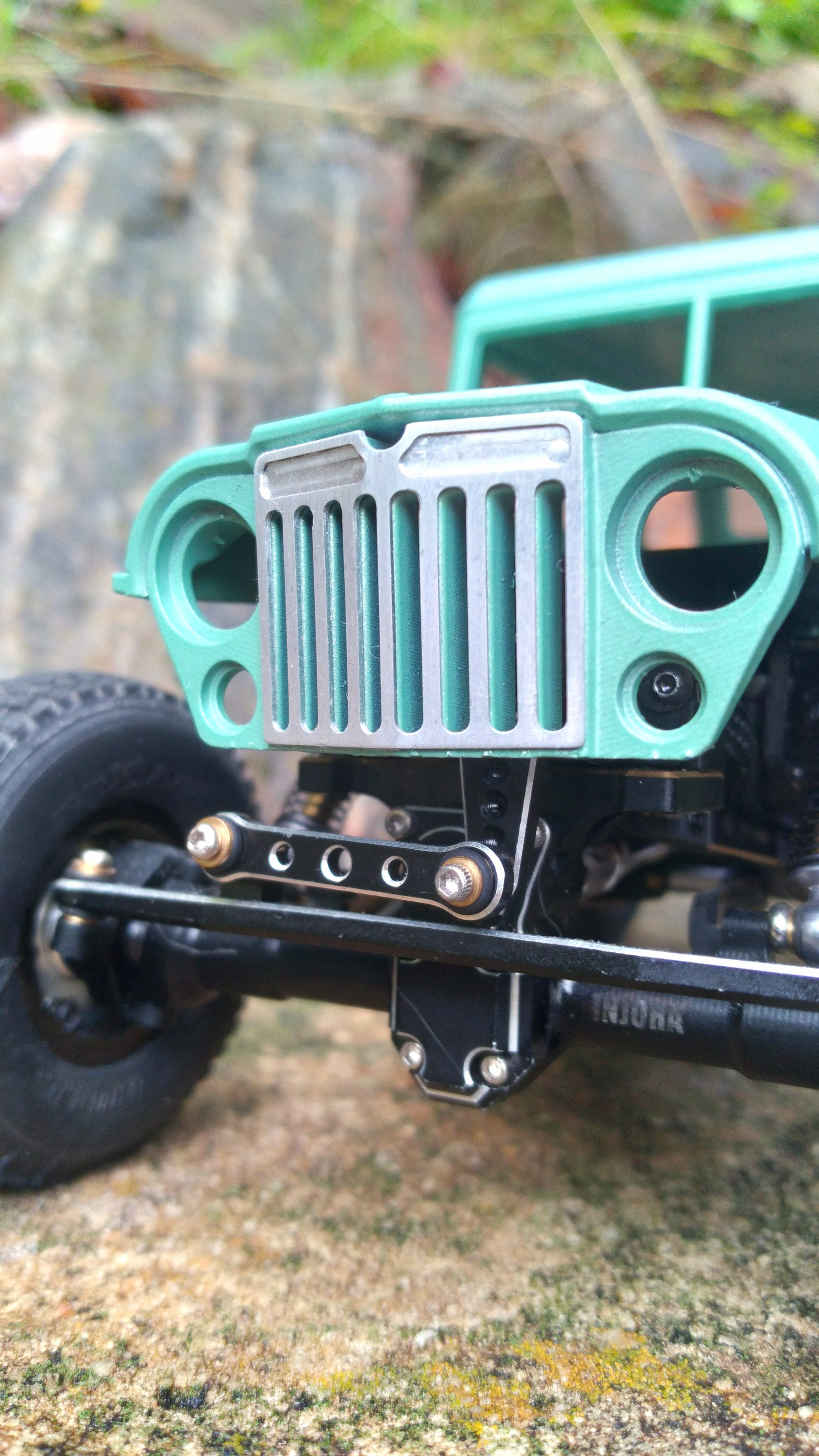 CNC Machined Aluminum Grille for WT Micro Willys SCX24 Bodies. Made in house and jig formed to perfectly fit over the contour of the Willys grille area. Comes packaged with protective item matched/formed packaging to ensure safe shipping.
